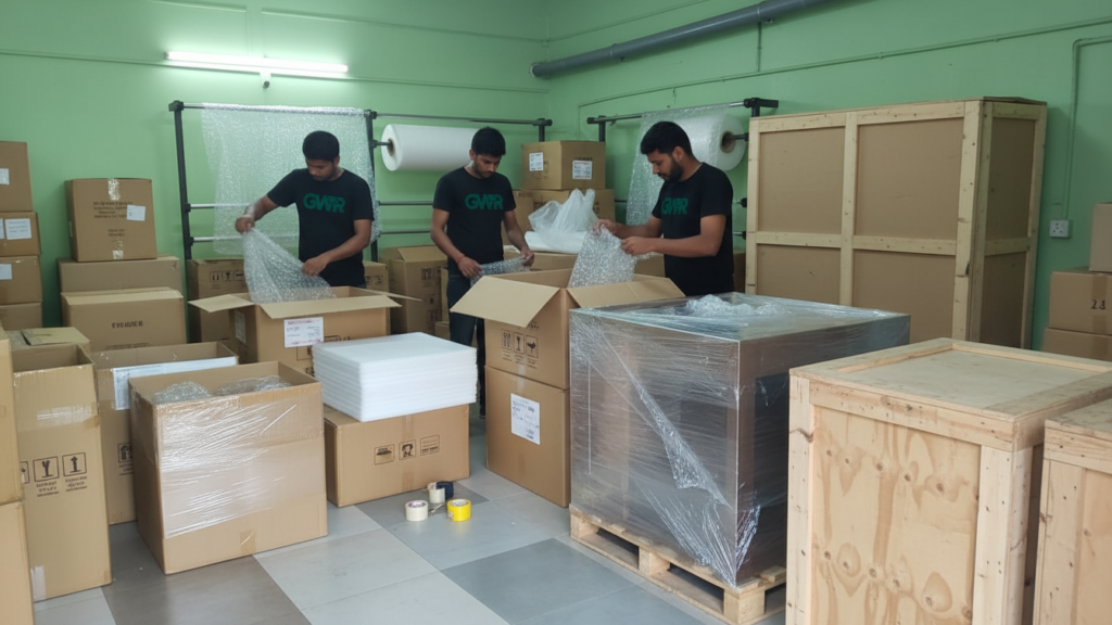 Use of bubble wrap, corrugated boxes, foam sheets, stretch film, and wooden crates for fragile items.